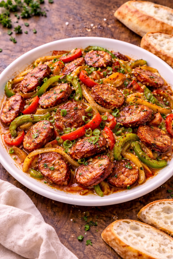 Cajun sausage and peppers is fast Louisiana comfort — smoky, colorful, and packed with flavor. Serve it hot and let the good times cook.