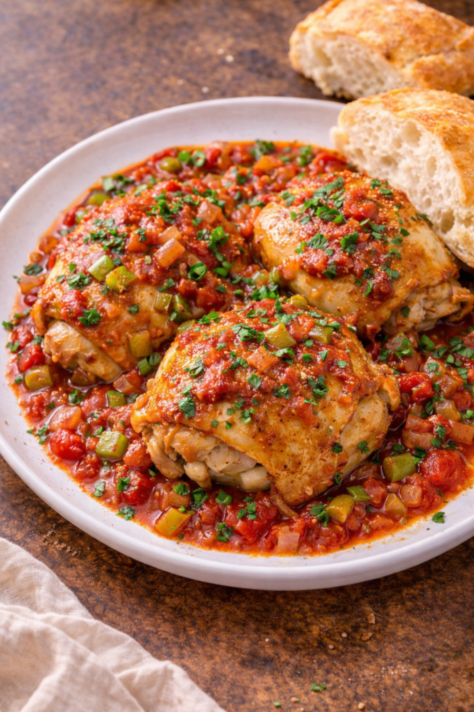 Tender chicken baked in a rich Creole tomato sauce with the holy trinity of vegetables — hearty, saucy, and pure Louisiana comfort.