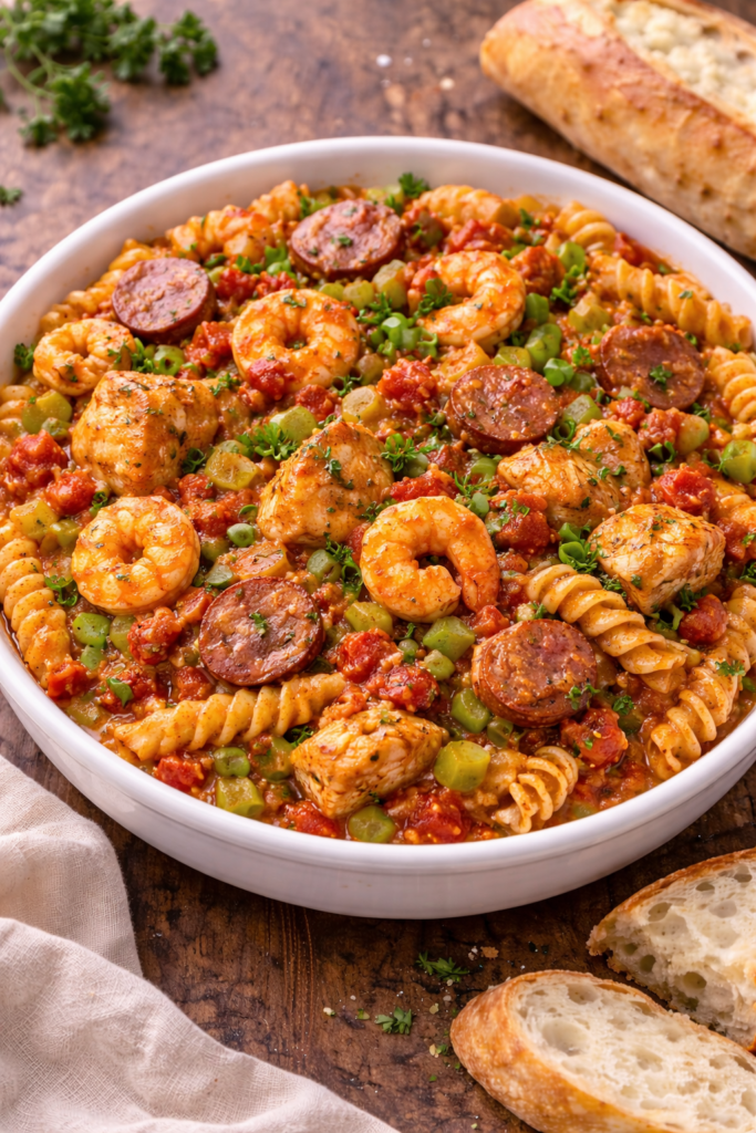 A bold Louisiana twist on jambalaya made with pasta — smoky, savory, and built for feeding a crowd.